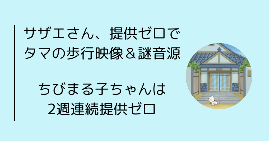 2/2放送のサザエさんでついに提供ゼロ 2/2(日)18:30~に放送されたサザエさんは、オープニングが流れた後、いつもの青い背景の花の映像が一瞬流れた後、タマだけが磯野家の前を通り過ぎる映像が流れました。 サザエさんの提供紹介はタマが磯野家の前を横切... -